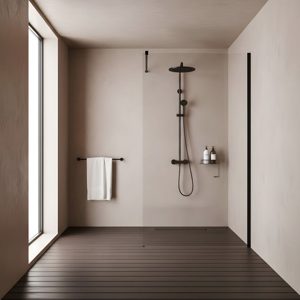 Sprchovou zástěnu je možné instalovat na sprchovou vaničku nebo přímo na podlahu s kombinací odtokového žlabu. Pokud vyberete odtokový žlab stejné barvy, jako máte profil a vzpěru, bude sprchová část vypadat velmi elegantně.