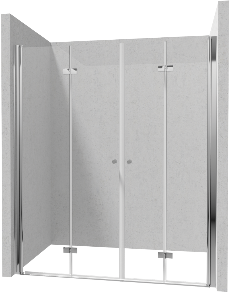 Sprchové dvojité zalamovací dveře určeny do niky KERRIA PLUS výšky 2000 mm s transparentním sklem TOTAL WHITE o síle 6 mm je podrobeno procesem kalení, kdy se sklo stává tvrdším, pružnějším a odolnějším. Profilový systém umožňuje kompenzovat zakřivení stěn, a mají skryté upevňovací prvky. Moderní jednobodový úchyt je pokryt gumovou ochrannou vrstvou. V nabídce jsou rámy chromové nebo v matném černém provedení. Dveře se vyznačují velmi tichým chodem, a to díky magnetickému těsnění, které změkčuje zavírání.