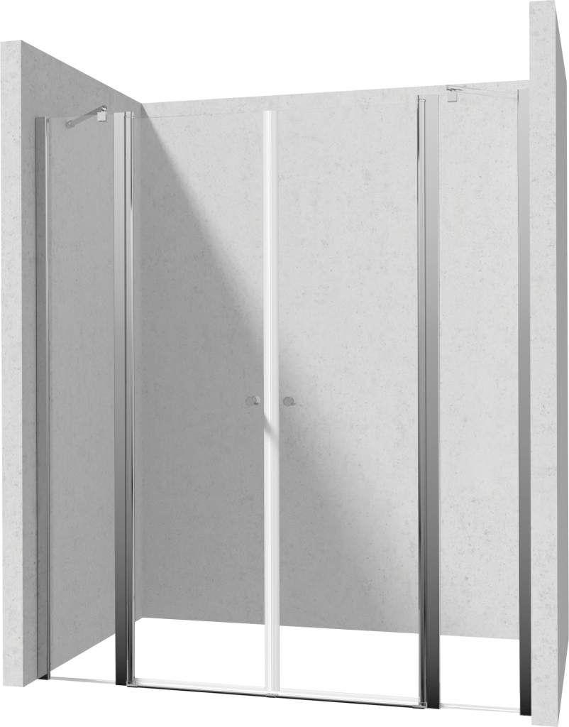 Sprchové dveře KERRIA PLUS výšky 2000 mm s pevnými polemi a dveřmi otevíranými pouze ven. Jako výplň je použito transparentní sklo o síle 6 mm, které je podrobeno procesem kalení, kdy se sklo stává tvrdším, pružnějším a odolnějším. Sprchová zástěna je pokryta vrstvou Active Cover, která má hydrofobní vlastnosti. Nejsou zde žádné nevzhledné skvrny a čištění není potřeba tak často. V nabídce jsou rámy chromové nebo v matném černém provedení.