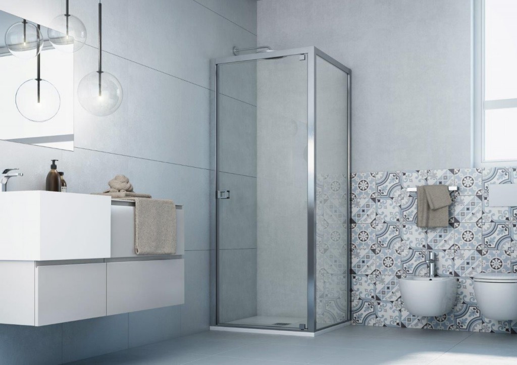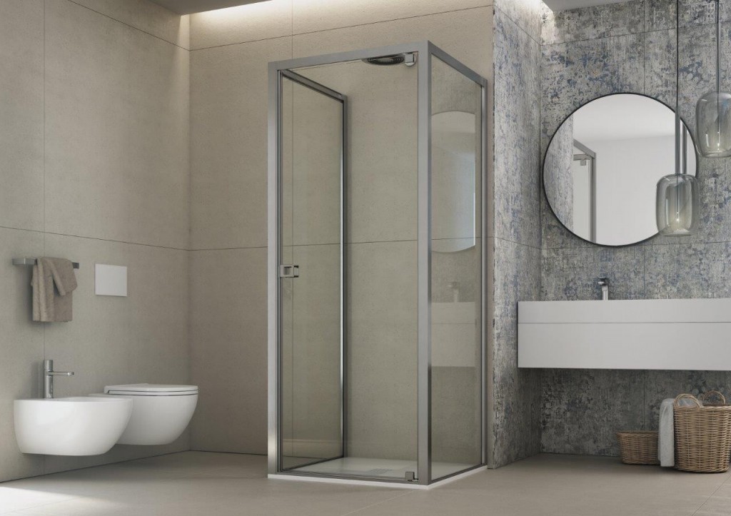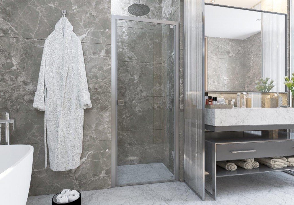 Pivotové skleněné dveře ESSENCE N1B řeší atypické vstupy v prostorných koupelnách. Velmi luxusní vzhled a design je podpořen profilem jehož barvu si můžete vybrat ze dvou barevných variant. Dále z kvalitního 6 mm bezpečnostního skla, které si můžete vybrat ze dvou variant a designovým madlem. Dodávají se v universálním levém / pravém provedení. Lze dokoupit jednu nebo dvě boční pevné stěny ESSENCE F1C pomocí kterých poskládáte praktický sprchový kout. Pevná stěna je dodávána v univerzálním levém / pravém provedení. Výška zástěn je 200 cm. Bezpečnostní sklo lze opatřit za příplatek povrchovou úpravou AQUA CLEAN pro jednodušší údržbu.