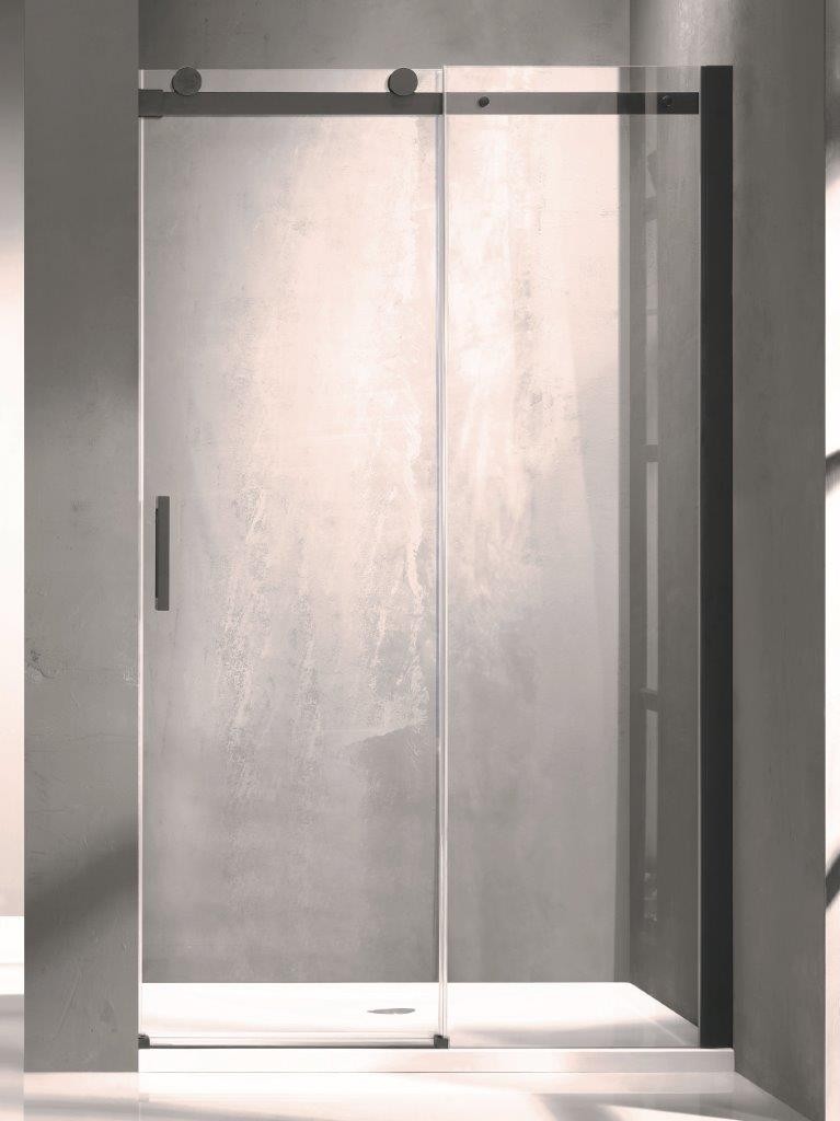 Luxusní skleněné posuvné dveře do niky v kvalitní černé barvě hliníkových profilů. Plynulý a komfortní pohyb dveří zajišťují horní masivní bezúdržbová ložisková kola a spodní vodící díl. Díky absenci spodního vodícího profilu, vzniká ideální bezbariérový vstup do sprchy. Tyto dveře jsou vyrobeny ze skel o síle 8 mm. Dodává se v univerzálním pravém i levém provedení.