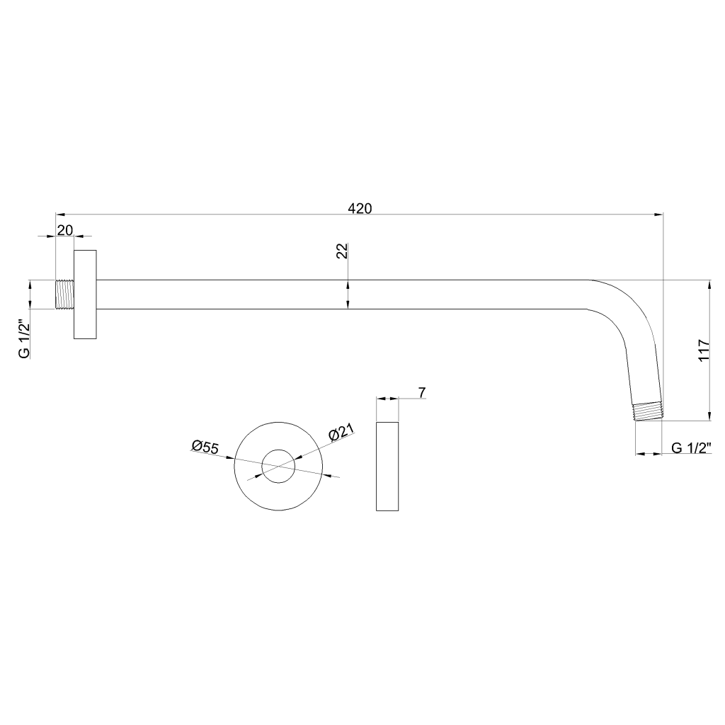 Sprchové rameno s montáží na stěnu, rozměry Ø 2,2 cm, délka 40 cm.