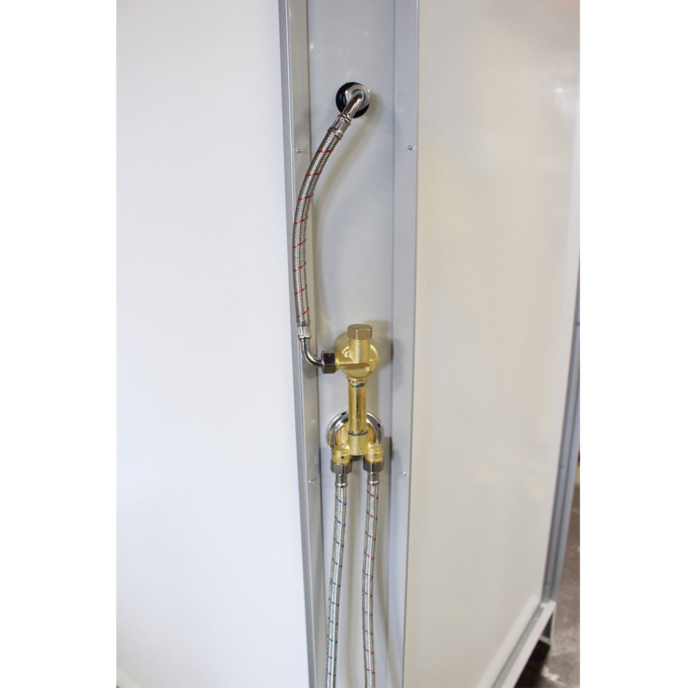 Spodní pojezdy umožňují odklopení posuvné části sprchového koutu a vyčištění běžně nedostupných míst. Těsnost mezi pevnou a posuvnou částí je zajištěna stíracími a silikonovými lištami na obou dvou částech. K připojení boxu do vodovodního řádu je možné použít nerezové opletové hadičky, které naleznete také v naší nabídce (součástí balení jsou nerezové připojovací hadice 1/2" o délce 60 cm).