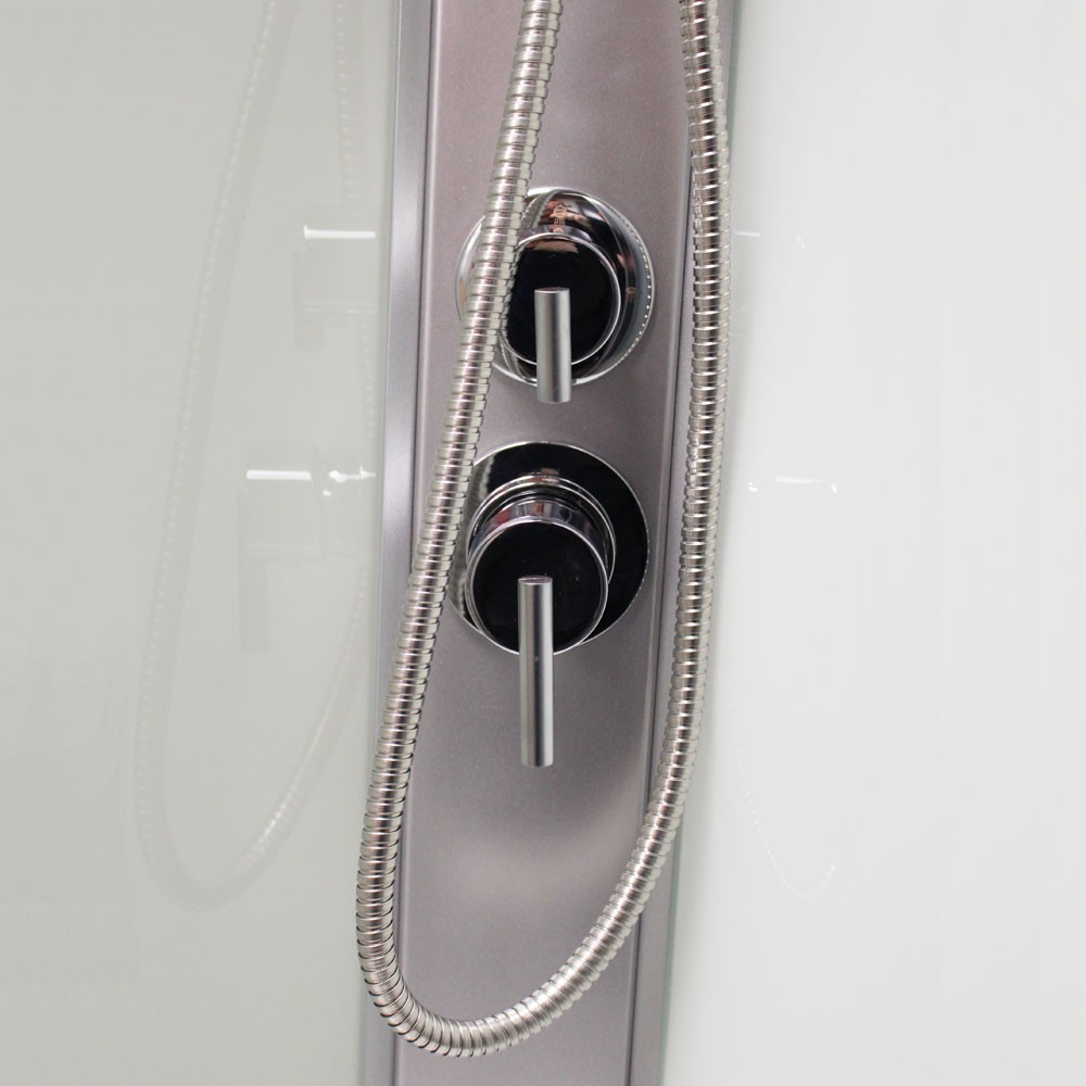 Sprchový box vnáší do ekonomické třídy nový rozměr kvality. Sklo je v designu Point, satin ALU profil. Tloušťka bezpečnostního skla je 5/4 mm. Sklo je dokonale utěsněno silikonovými lištami, nejedná se však o hermeticky uzavřený výrobek. Sprchový kout je osazen posuvnými dveřmi, které mají kvalitní dvojkolečkové horní pojezdy s možností perfektního seřízení. Dorazy zajišťují minimální nárazy při otevírání a zavírání sprchového koutu.