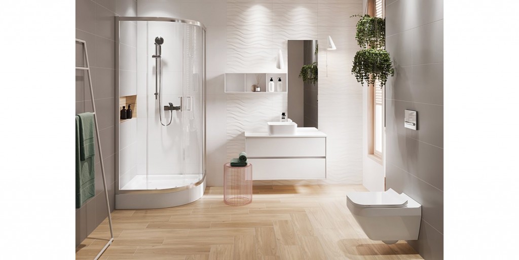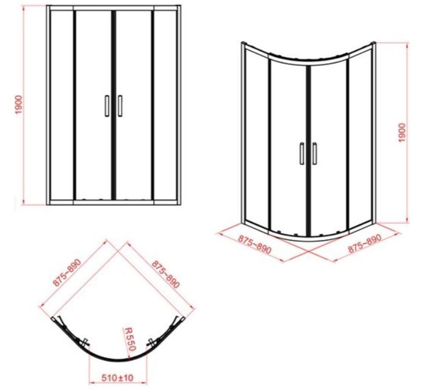 Čtvrtkruhový sprchový kout značky CERSANIT s hliníkovým profilem v chromovém provedení, doplněný dvoubodovými madly. Výplní je čiré sklo s povrchovou úpravou EASY CLEAN o síle 5 mm.
