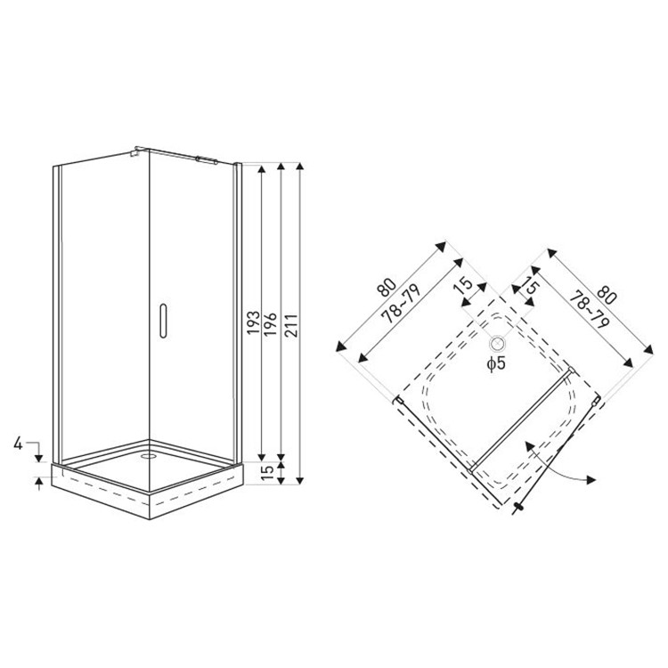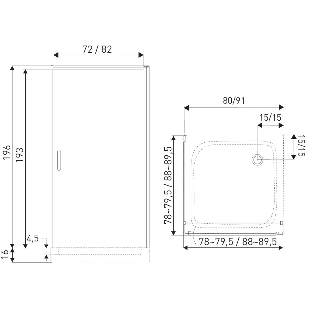Čtvercový sprchový kout je dodávaný se sprchovou vaničkou o rozměrech 80 x 80 x 15 cm. K vaničce je potřeba dokoupit sifon – doporučujeme model Speed s průměrem 50 mm pro optimální odvod vody.