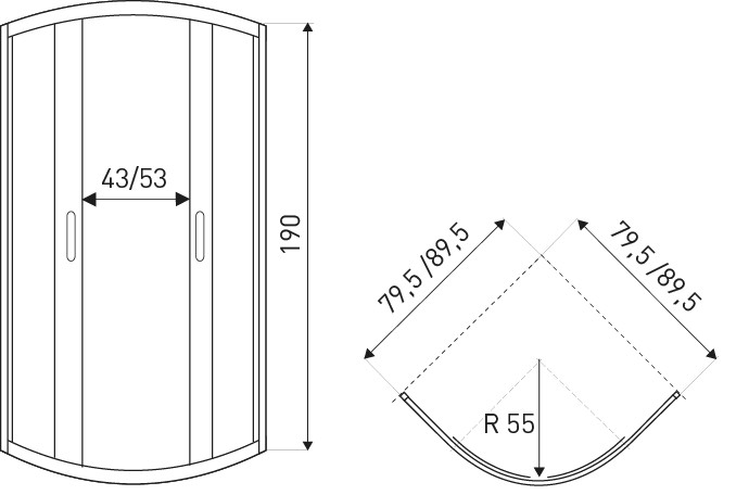 Sprchový kout je kompatibilní s vaničkami Aron, Alan a dalšími standardními čtvrtkruhovými sprchovými vaničkami o rozměrech 80×80 cm s poloměrem zakřivení R55.