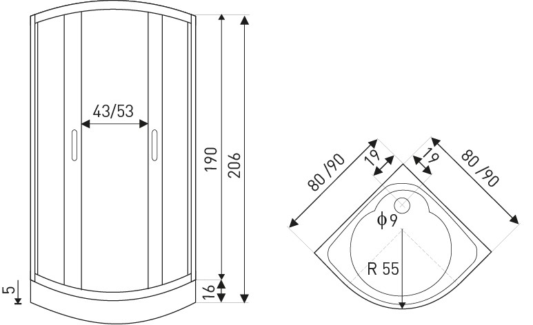 Součástí balení je i bílá sprchová vanička výšky 16 cm a praktickým odtokem o průměru 90 mm. Díky výšce od podlahy k odtoku vaničky 10,5 cm a poloměru zaoblení R55 se vanička snadno začlení do jakéhokoli koupelnového prostoru.