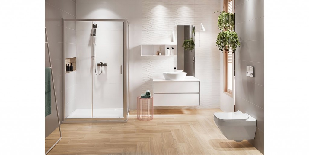 Obdélníkový sprchový kout značky CERSANIT s hliníkovým profilem v chromovém provedení, doplněný dvoubodovým madlem. Výplní je čiré sklo s povrchovou úpravou EASY CLEAN o síle 5 mm.