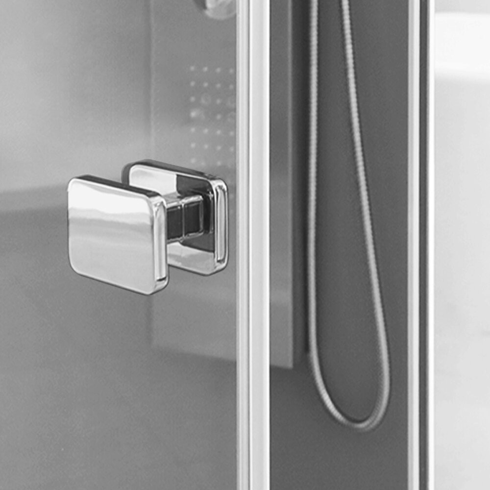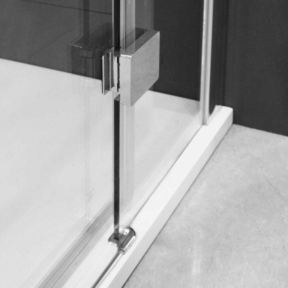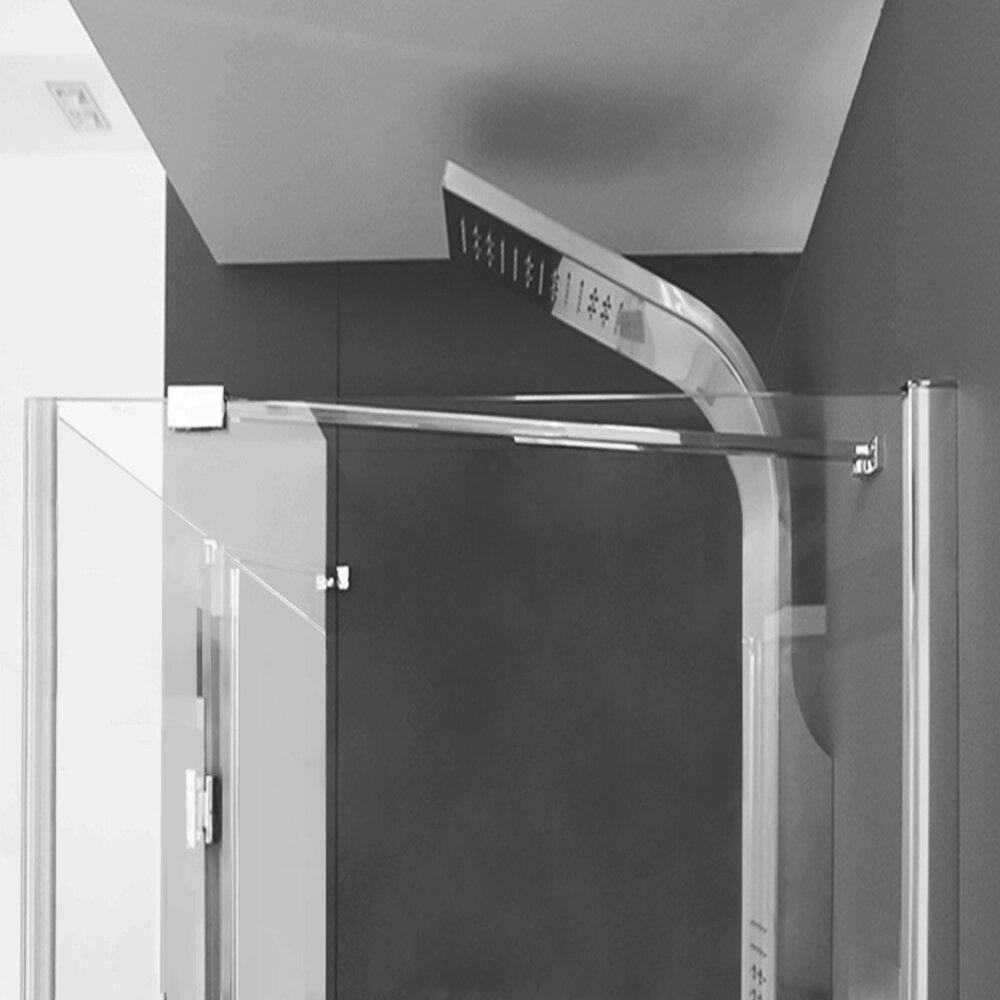 Sprchový kout obdélníkový s jedněmi otevíracími dveřmi na masivních chromových pantech, s upevňovacími kovovými konzolami. Čisté minimalistické linie kování.