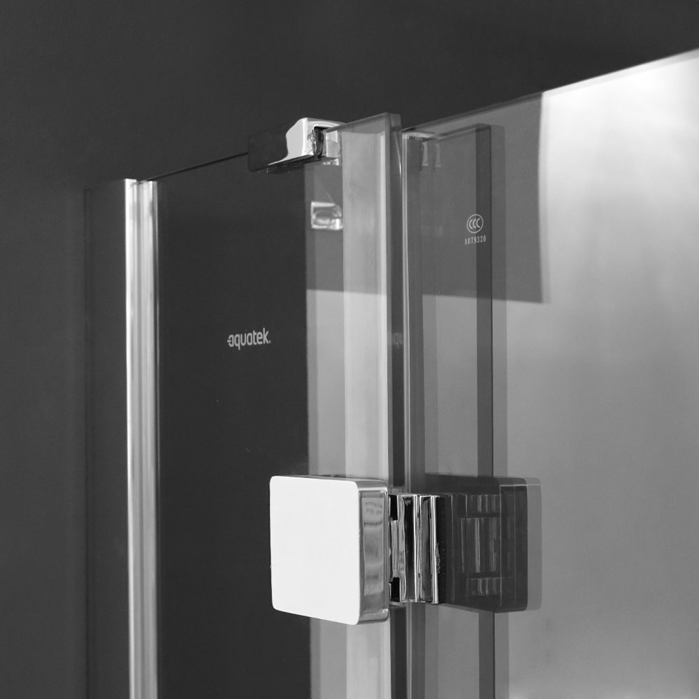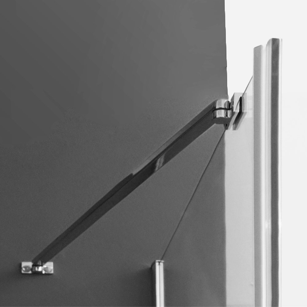 Sprchový kout obdélníkový s jedněmi otevíracími dveřmi na masivních chromových pantech, s upevňovacími kovovými konzolami. Čisté minimalistické linie kování.