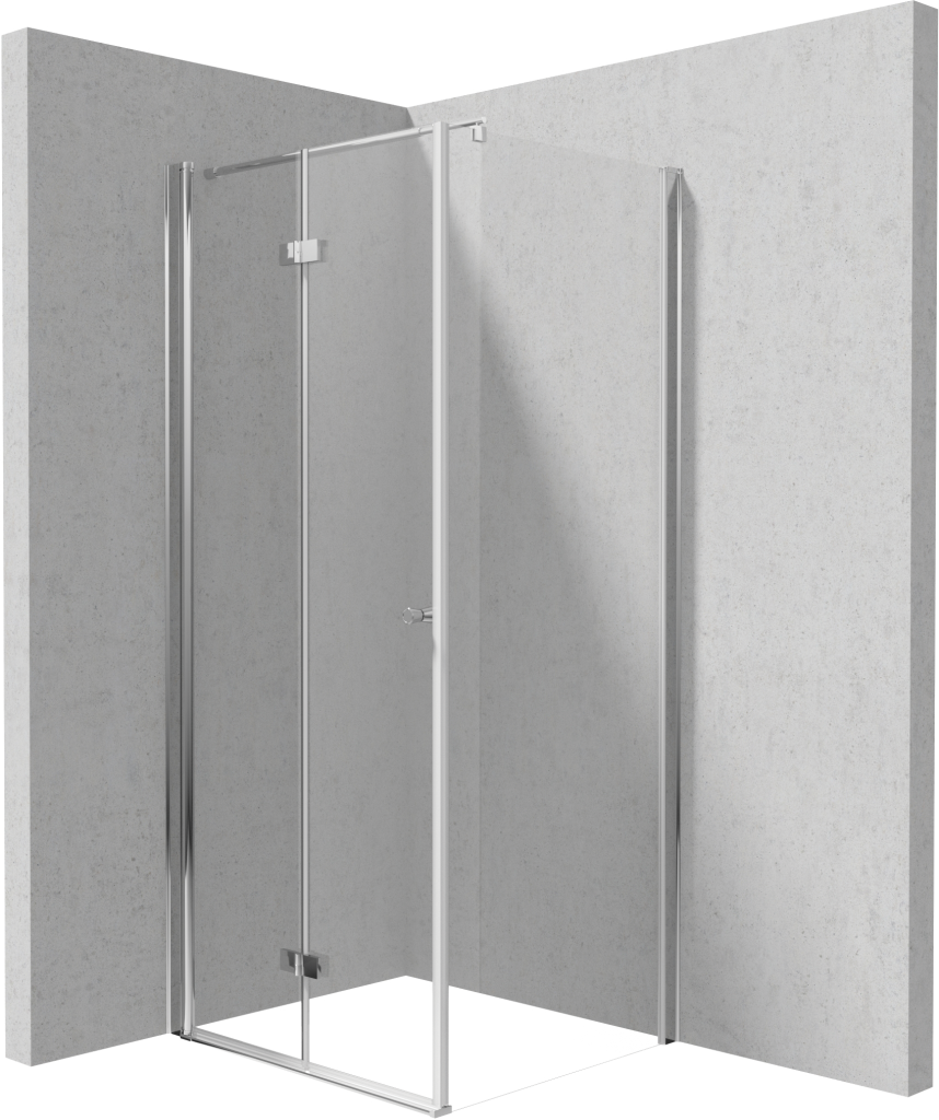 Sprchový kout KERRIA PLUS se zalamovacími dveřmi a pevnou boční stěnou KERRIA PLUS výšky 2000 mm s transparentním sklem TOTAL WHITE o síle 6 mm je podrobeno procesem kalení, kdy se sklo stává tvrdším, pružnějším a odolnějším. Profilový systém umožňuje kompenzovat zakřivení stěn, a mají skryté upevňovací prvky. Moderní jednobodový úchyt je pokryt gumovou ochrannou vrstvou. V nabídce jsou rámy chromové nebo v matném černém provedení. Sprchový koout se vyznačuje velmi tichým chodem dveří, a to díky magnetickému těsnění, které změkčuje zavírání.