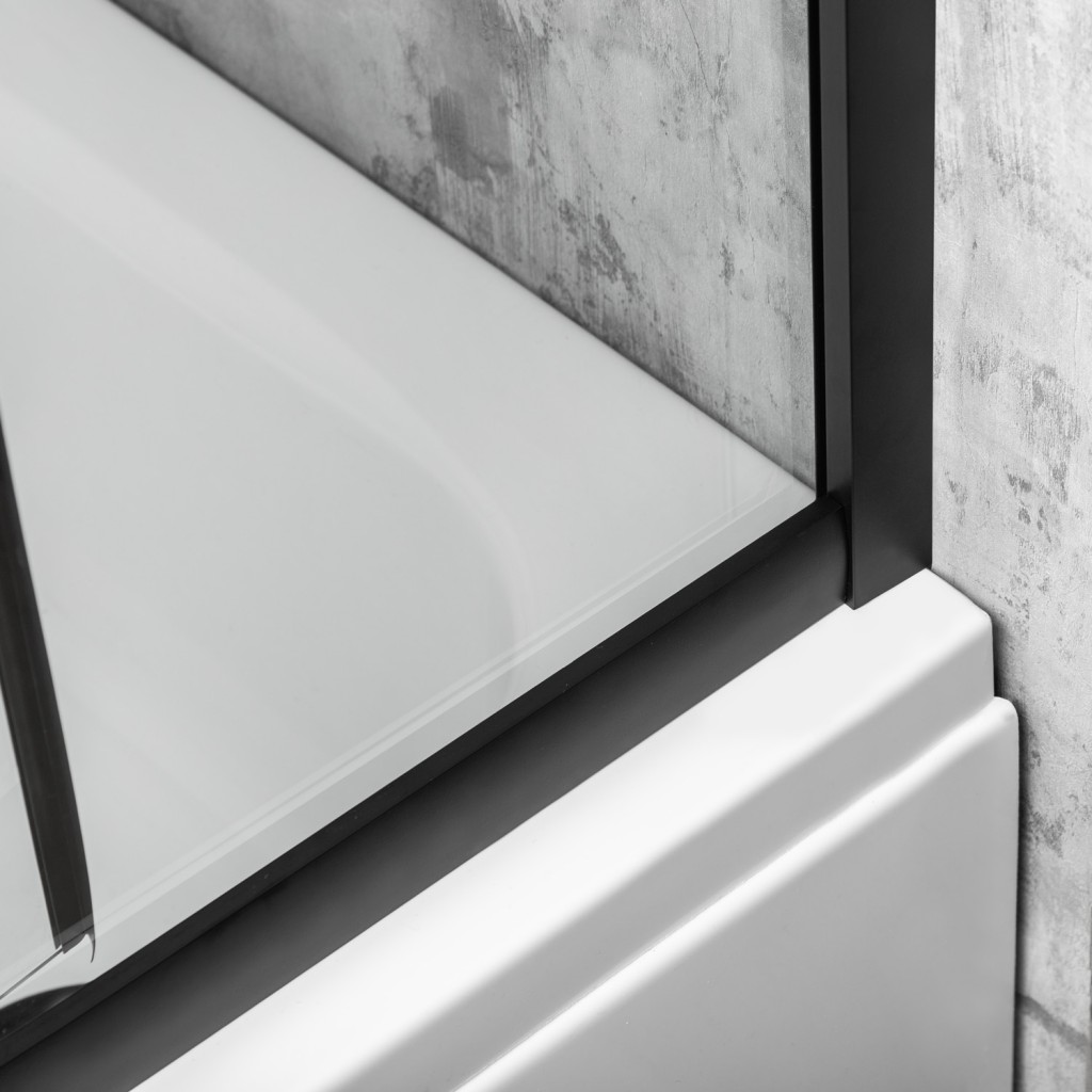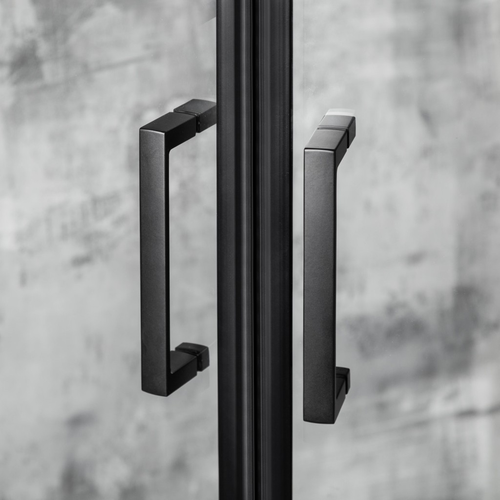 Kabina je vybavena posuvnými dvoukřídlými dveřmi , které zajišťují plynulé otevírání a zavírání. Průhledné tvrzené sklo o tloušťce 5 mm zajišťuje bezpečnost a odolnost, zatímco černé hliníkové profily zdůrazňují moderní charakter sestavy.