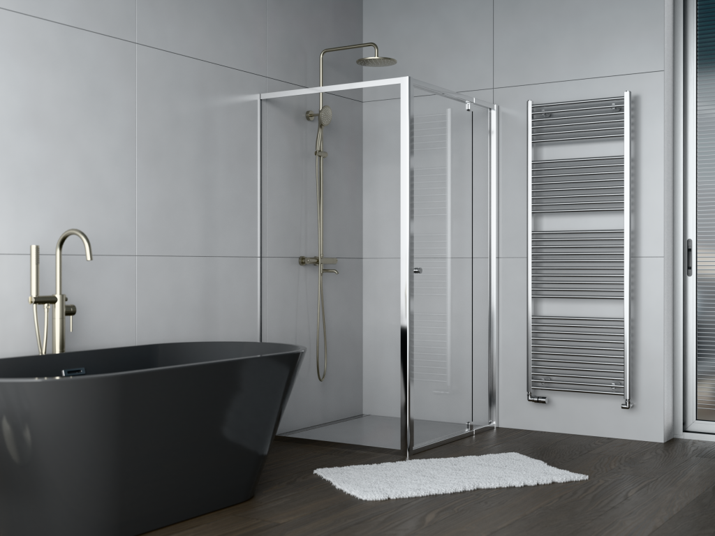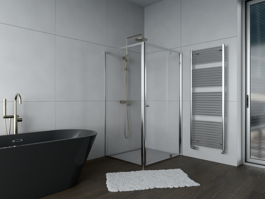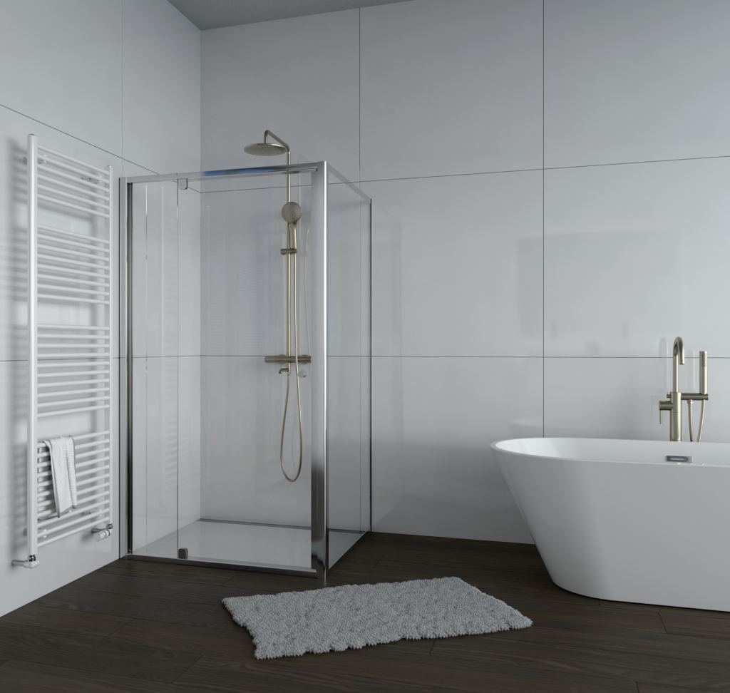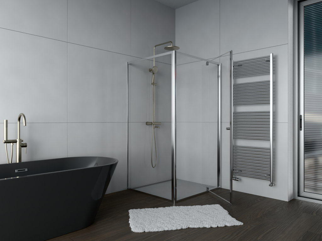 Elegantní rohový sprchový kout STYLE kombinuje čistý design, chromové detaily a kvalitní zpracování. Skládá se z jednokřídlých otočných dveří, pevné boční stěny a vaničky z litého mramoru. Díky čirému bezpečnostnímu sklu a robustní konstrukci nabízí komfort, estetiku i dlouhou životnost.