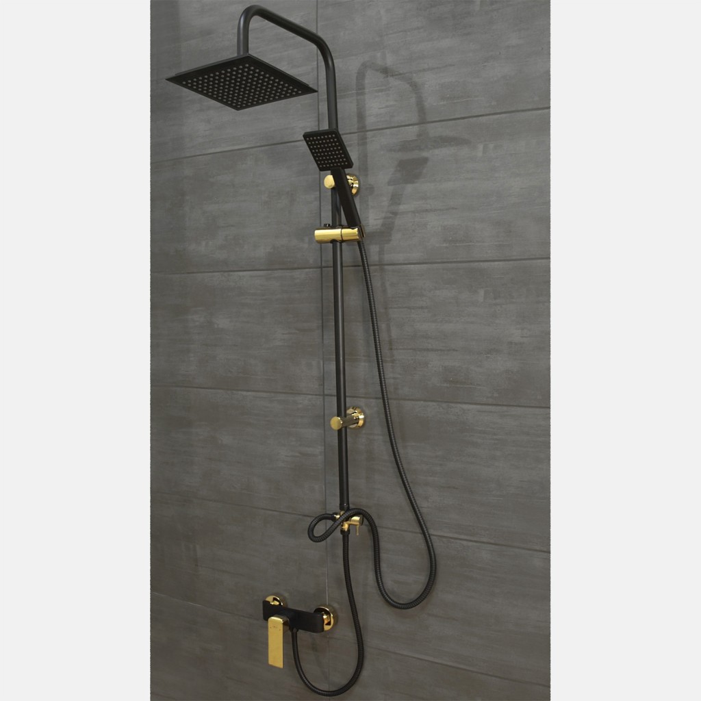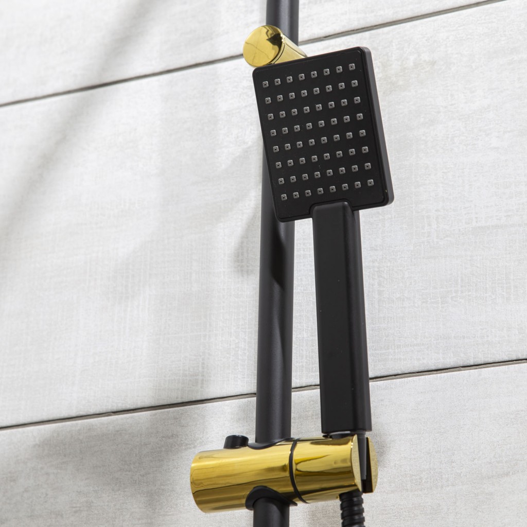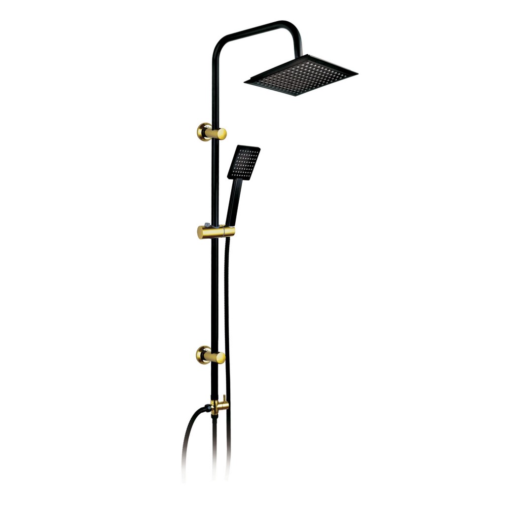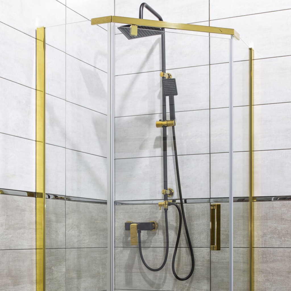 Černá sprchová sada se zlatými doplňky , kterou nabízíme, má rozměry 110 x 20,5 x 48 cm. Sprcha má možnost nastavit rozteč montážních konzol od 30 do 80 cm. Sprchová sada Denis 63 je vybavena odolnou a proti poškození odolnou hadicí o délce 150 cm a rukojetí, která umožňuje pohodlné zavěšení sprchové hlavice. Sprchová hlavice a dešťová sprcha, které jsou součástí sady, mají jeden počet typů trysek. Sprchová sada Denis 63 má stylovou čtvercovou dešťovou sprchu ve zlaté barvě. Jeho rozměry jsou 20 x 20 cm.