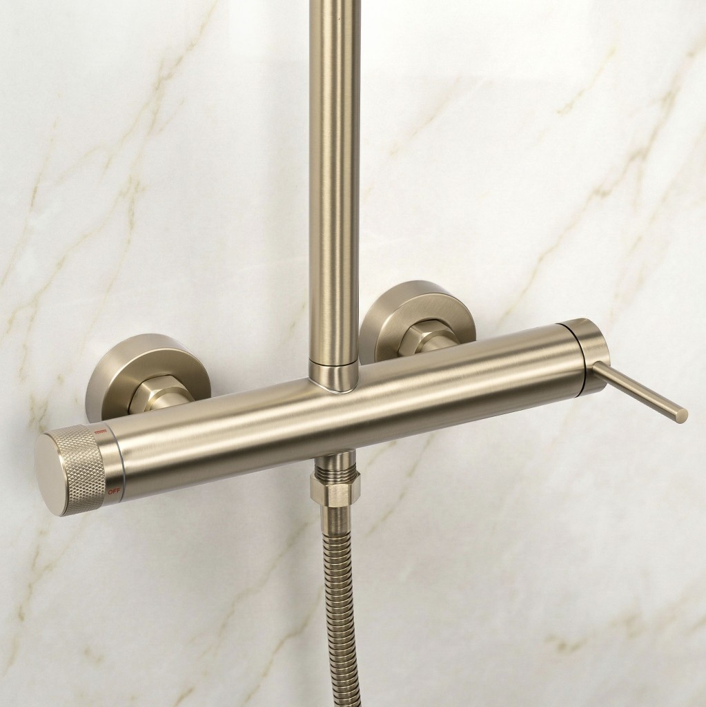 Hledáte funkční a stylové řešení pro svou sprchovou zónu? Seznamte se s nástěnným sprchovým setem Rea Foss Clif v moderním provedení Kartáčované Zlato. Ideální volba pro ty, kteří oceňují minimalistický design a promyšlené funkce. Pevné mosazné tělo baterie a nastavitelná výška dešťové sprchy poskytují pohodlí při používání.Barva Kartáčované Zlato – elegantní povrch (v technologii PVD), který skvěle ladí s moderními koupelnami.Mosazné tělo baterie – zaručuje pevnost konstrukce a odolnost při každodenním používání.Multifunkční ruční sprcha – nabízí nejen standardní režimy, ale také inovativní proud typu „bidetka“ umístěný v horní části sprchy, což výrazně zvyšuje funkčnost koupelny.Keramická kartuše – přesný mechanismus umožňující plynulou regulaci teploty a průtoku vody.Systém Anti-Calc – trysky ve sprše a dešťové hlavici usnadňují odstraňování vodního kamene.Nástěnná montáž – standardní rozteč 150 mm umožňuje snadnou a rychlou instalaci.Sprchový set Rea Foss Clif je skvělou volbou pro ty, kteří si cení moderního designu a nadstandardní funkčnosti. Tento set REA zvyšuje komfort každodenního sprchování a dodá vaší koupelně spolehlivost i stylový vzhled.