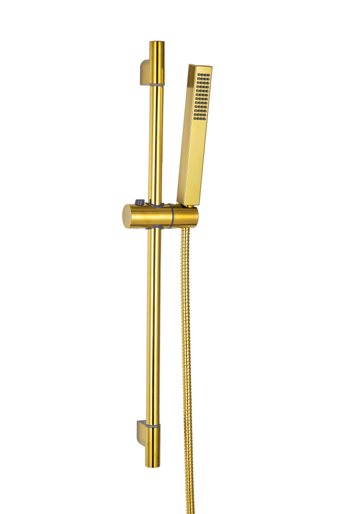 Zlatý, nástěnný sprchový set GLAMOUR s hranatou jednofunkční sprchou je dokonalým doplňkem k vanové nebo sprchové baterii. Anti-calc je systémem proti usazování vodního kamene a umožňuje snané čištění pomocí přejetí rukou.