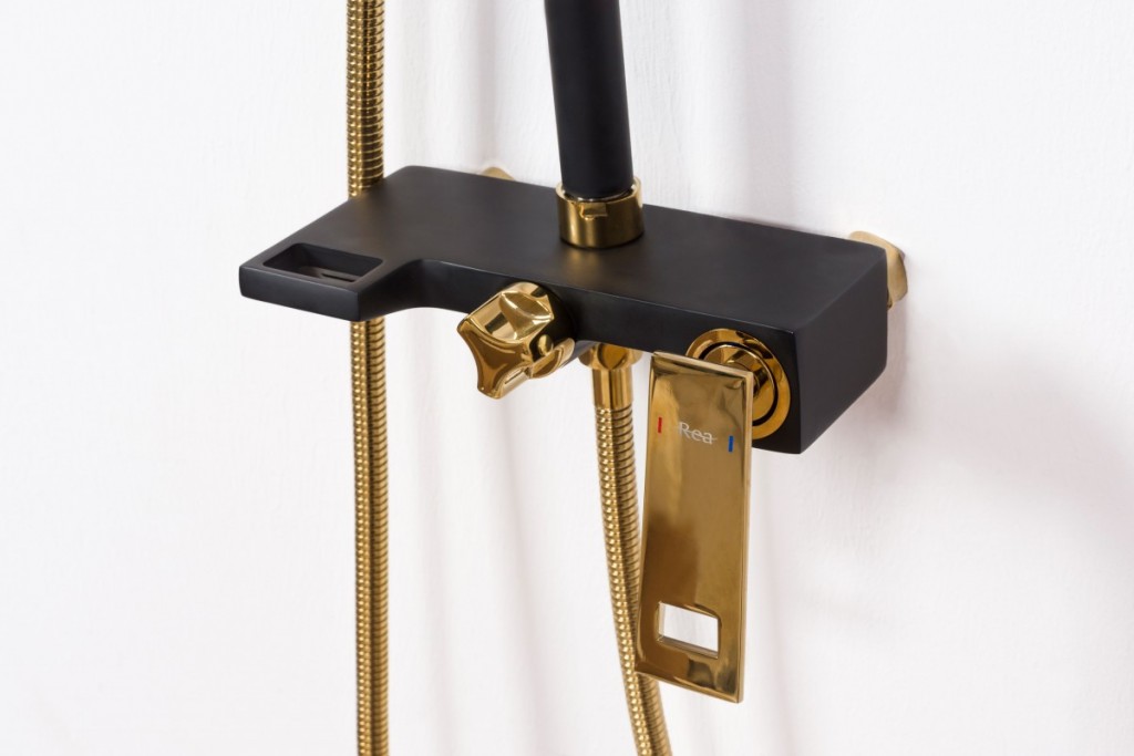 Černozlatý sprchový set Rea Gio byl navržen na pohodlí a funkčnost. Moderní a jedinečný design a vysoká kvalita použitých materiálů zaručují trvanlivost a spolehlivost po mnoho let.