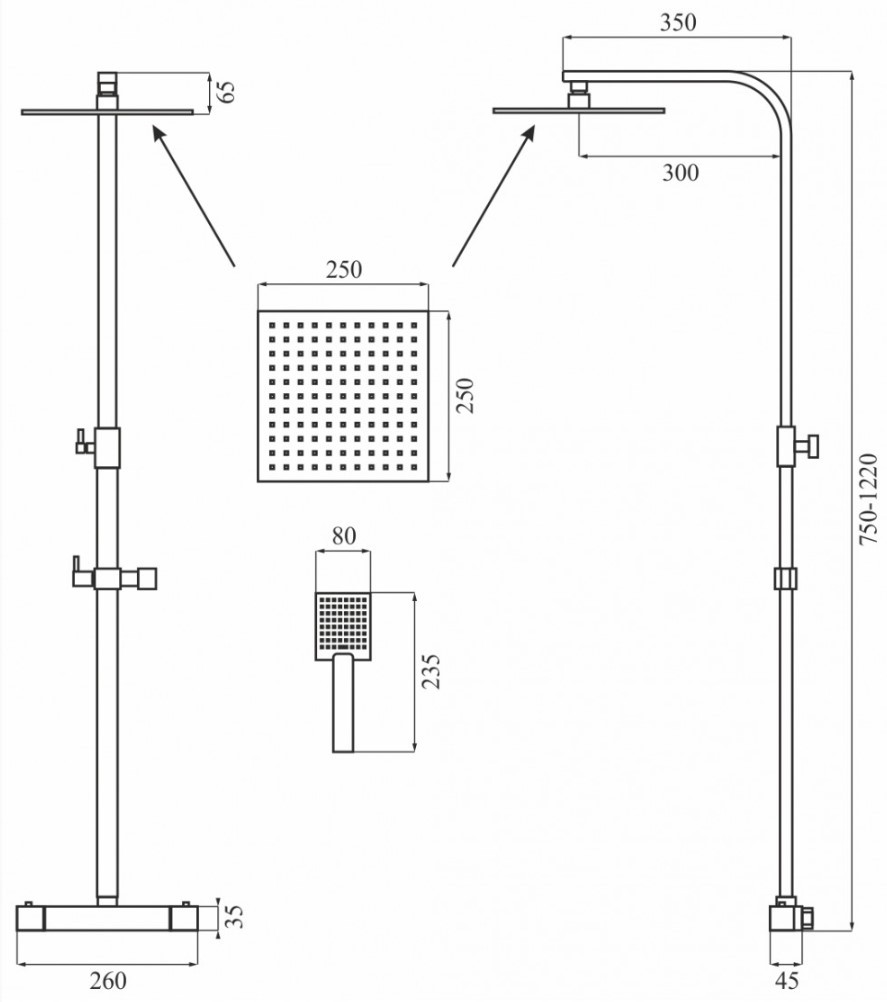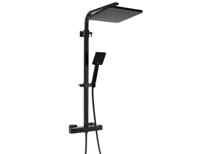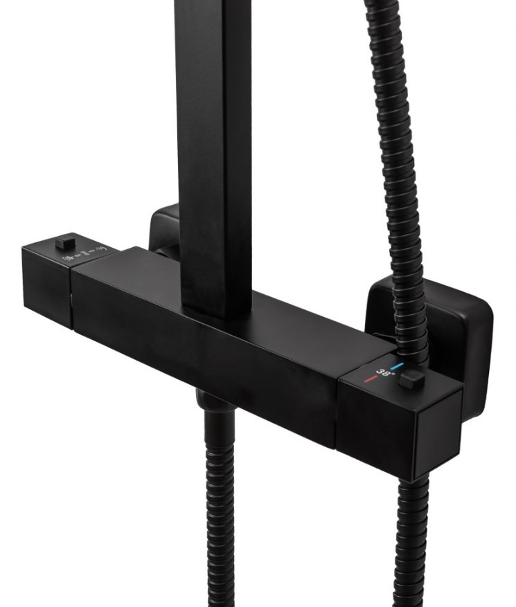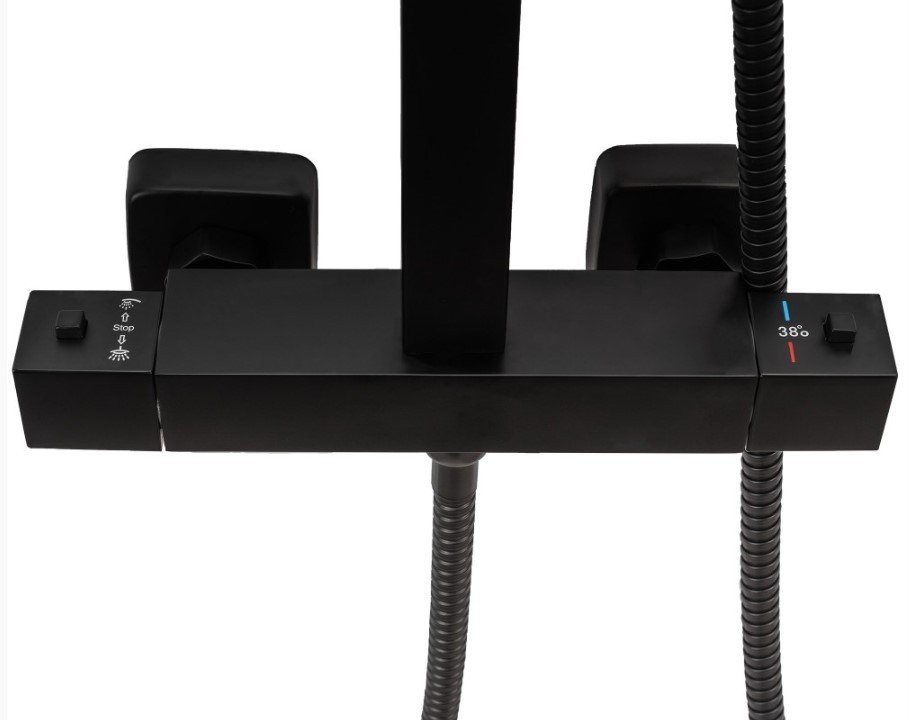 Součástí sprchového setu je mosazná baterie s termostatyckým obládáním a roztečí 15 cm
