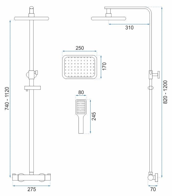 - nastavitelné sprchové tyče, rozsah 820-1200 mm