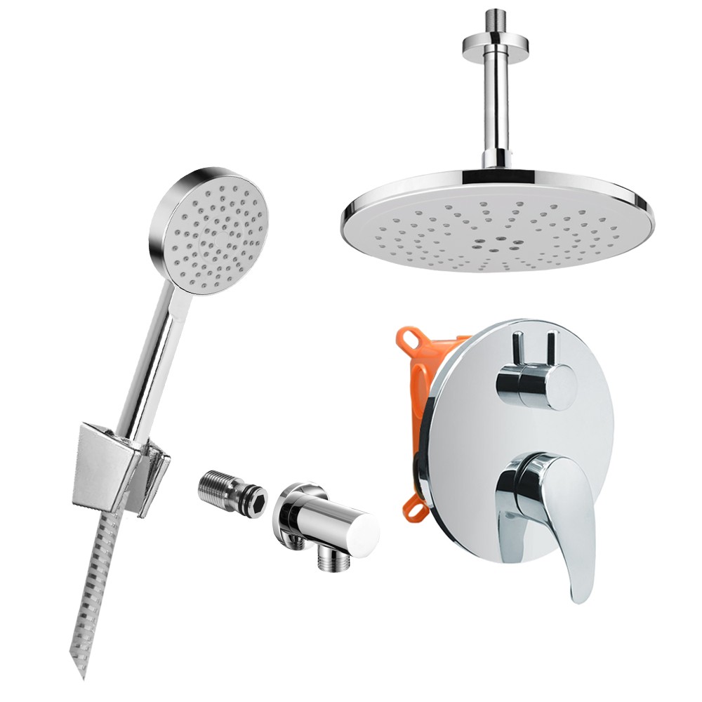 Dvoucestná podomítková baterie s keramickým přepínačem, Mbox, oválný kryt, vývod, stropní rameno, talířová sprcha ø 235 mm, držák sprchy, nerezová dvouzámková hadice 150 cm, jednopolohová ruční sprcha.