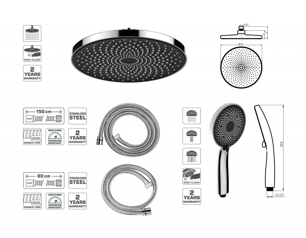 - Úchyty na zeď, polička, hadice (pro připojení setu 80 cm, pro připojení ruční sprchy 150 cm)