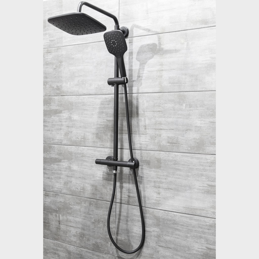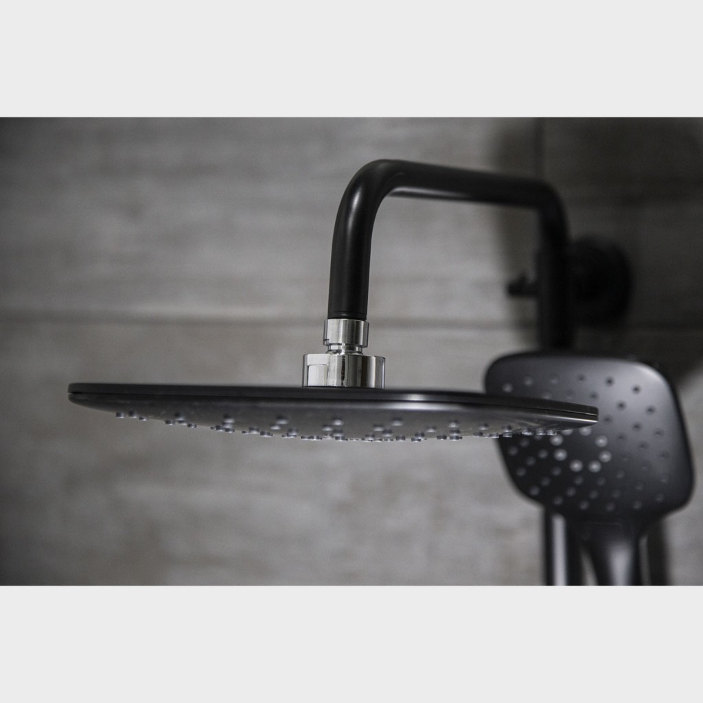 Sprchový set s termostatickou baterií a dešťovou sprchou v černém polomatném provedení , což je stále oblíbenější barva při zařizování koupelen.
