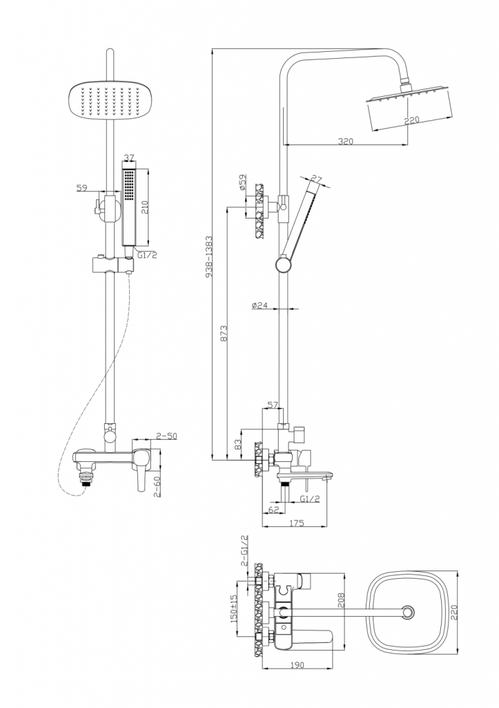 - výškově nastavitelný sprchový sloup od 94 do 138 cm