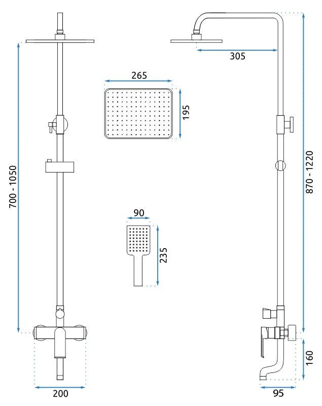 - ABS hlavové sprchy o rozměru 26,5x19,5 cm, kulový kloub umožňující libovolné polohování dešťové sprchy
