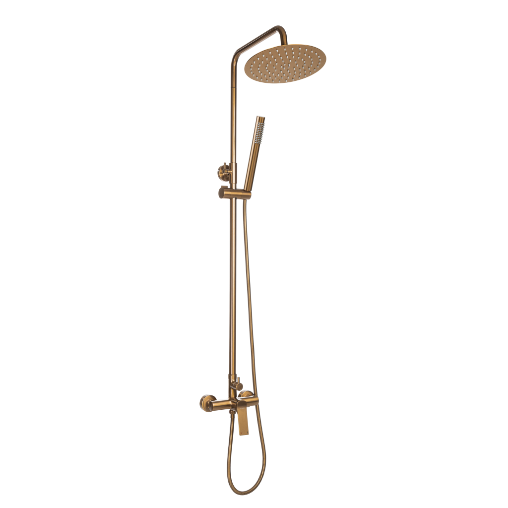 Tato sprchová hlavice s dešťovou sprchou a sprchovou baterií je ergonomické řešení, které se snadno čistí. Manuální spínač umožňuje úplnou kontrolu bez ohledu na tlak vody. Výška sprchové hlavice je nastavitelná od 99 do 163 cm, což umožňuje individuální nastavení podle výšky postavy v domácnosti. Sprchová hlavice i ruční sprcha jsou vybaveny systémem proti vodnímu kameni, který výrazně usnadňuje odstraňování vodního kamene ze sprchových hlavic. Celá jednotka je v módní měděné barvě. Teplý tón rozjasní interiéry zařízené v chladnějších tónech.