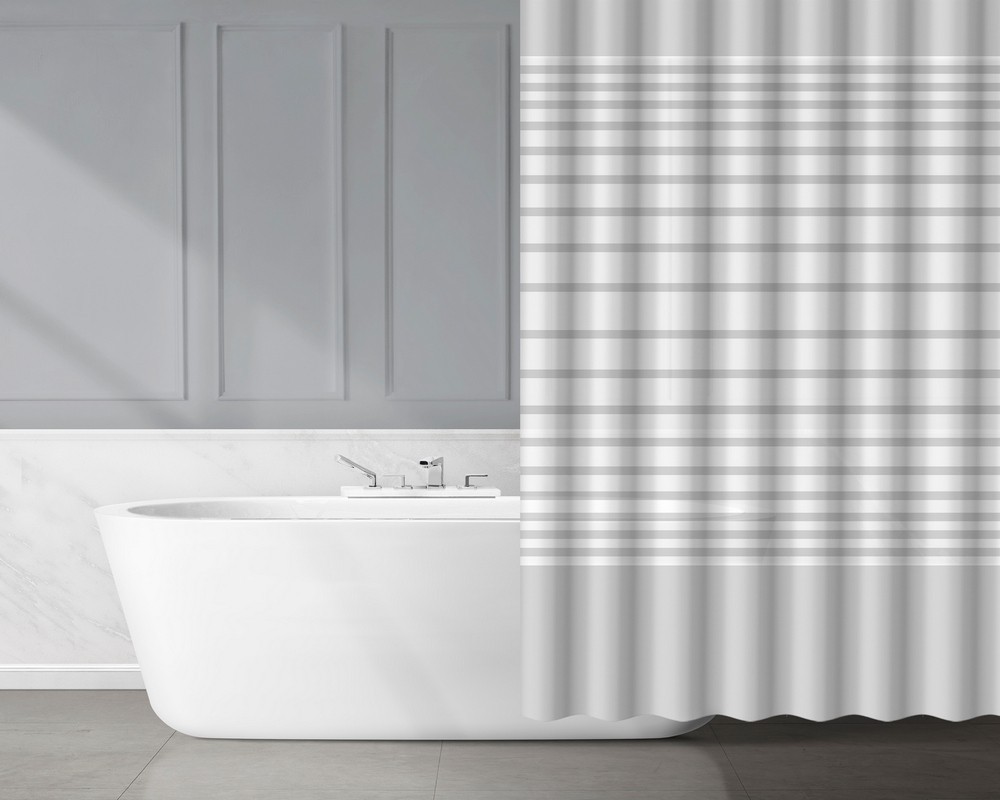 Vodotěsný, průsvitný sprchový závěs s bílými pruhy. Je vyrobena z materiálu EVA, tedy kvalitní fólie, která se vyznačuje vysokou kvalitou zpracování, voděodolností, příjemným na dotek a snadnou údržbou. Sada obsahuje 12 bílých závěsných kroužků. Fóliový sprchový závěs je vhodný pro jemné ruční čištění při 30 stupních. Nežehlit, chemicky nečistit, nebělit, nesušit v sušičce.