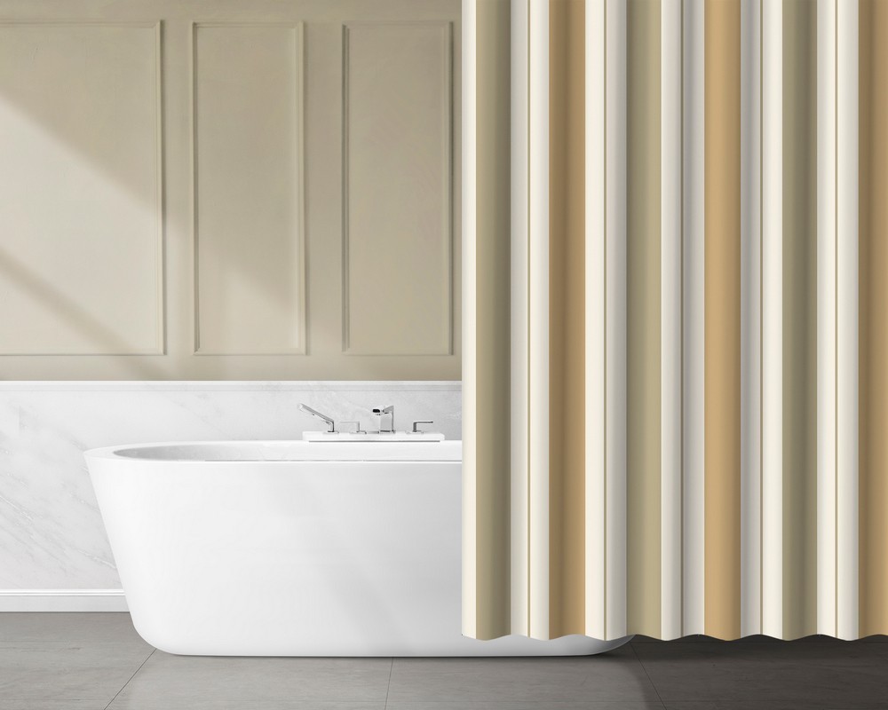 Béžový textilní sprchový závěs s hnědými pruhy z polyesteru. Sada obsahuje 12 bílých závěsných kroužků. Textilní sprchový závěs je vhodný pro šetrné praní na 30 stupňů a žehlení na nízkou teplotu. Nečistit chemicky, nebělit, nesušit v sušičce.