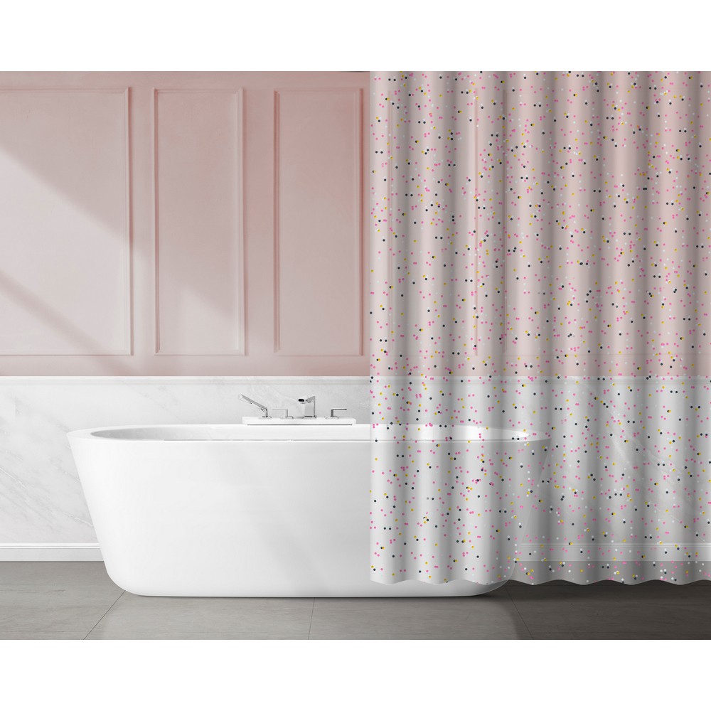 Sprchový závěs z materiálu EVA s transparentní úpravou, zdobený barevnými třpytkami, je moderním a poutavým doplňkem každé koupelny. Jeho třpytivé akcenty dodávají interiéru šmrnc a zároveň zachovávají lehký a jemný vzhled. Závěs měří 200 cm na výšku a 180 cm na šířku, takže se perfektně hodí do sprchového prostoru. Materiál EVA je voděodolný, snadno se čistí a je odolný, díky čemuž je tento závěs nejen stylový, ale také velmi praktický pro každodenní použití. Sada obsahuje 12 bílých kroužků na zavěšení. Tento plastový sprchový závěs je vhodný pro jemné čištění rukou při 30 stupních Celsia. Nežehlite, chemicky nečistěte, nebělte ani nesušte v sušičce.