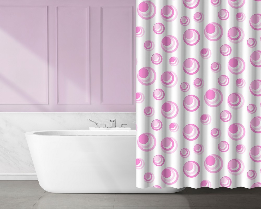 Voděodolný sprchový závěs v bílé barvě s motivem růžových kruhů v různých odstínech. Sada obsahuje 12 bílých závěsných kroužků. Fóliový sprchový závěs je vhodný pro jemné ruční čištění při 30 stupních. Nežehlit, nečistit chemicky, nebělit, nesušit v sušičce.