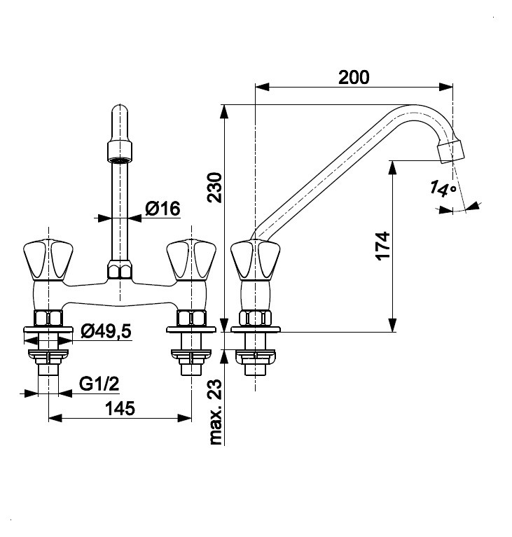 Stojánková umyvadlová baterie STANDARD od výrobce KFA ARMATURA s roztečí 150 mm. Výhodou je otočné ramínko o délce 200 mm a perlátorem.