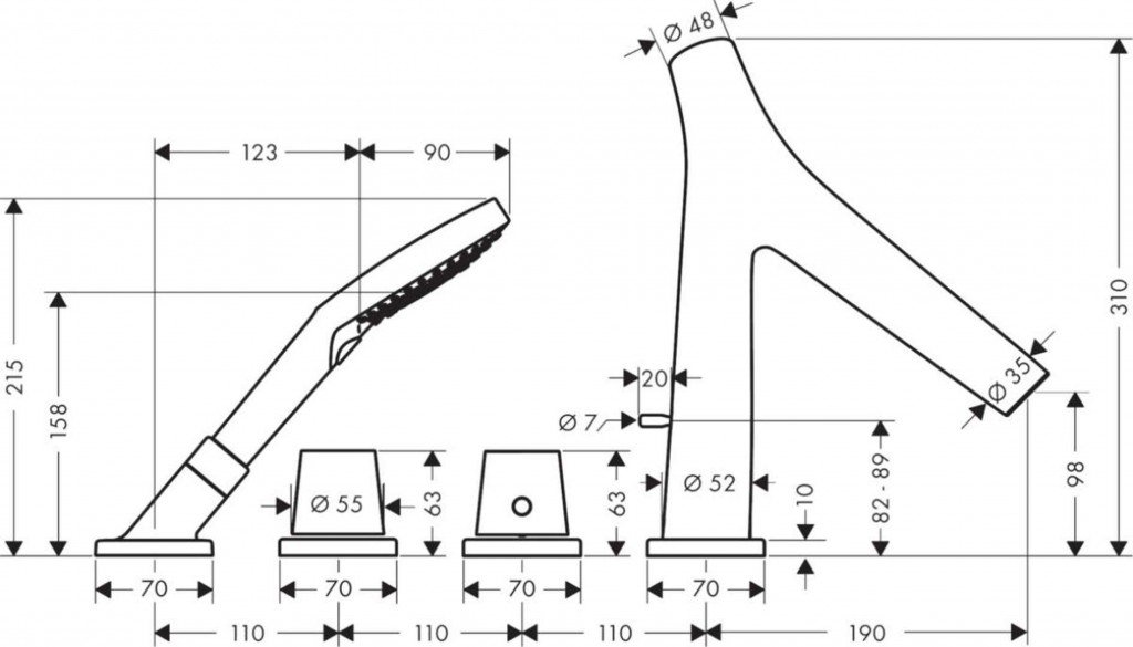 - obsahuje rukojeti, termostatickou kartuši, uzavírací ventil, vanový výtok s přepínačem a ruční sprchu Axor se 3 proudy # 26050xxx