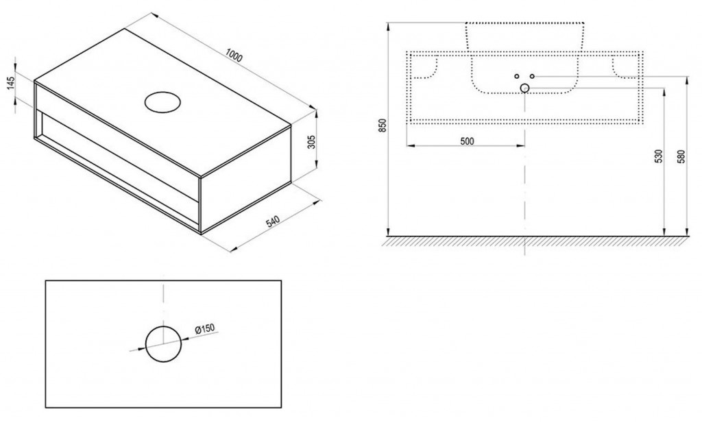 - 1 x vyztužená horní deska pro instalaci umyvadla, předvrtaný otvor uprostřed