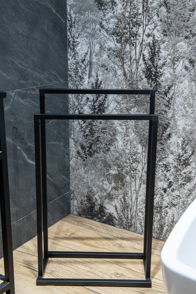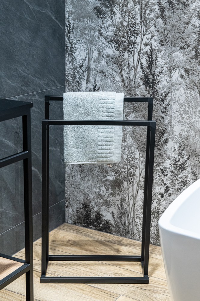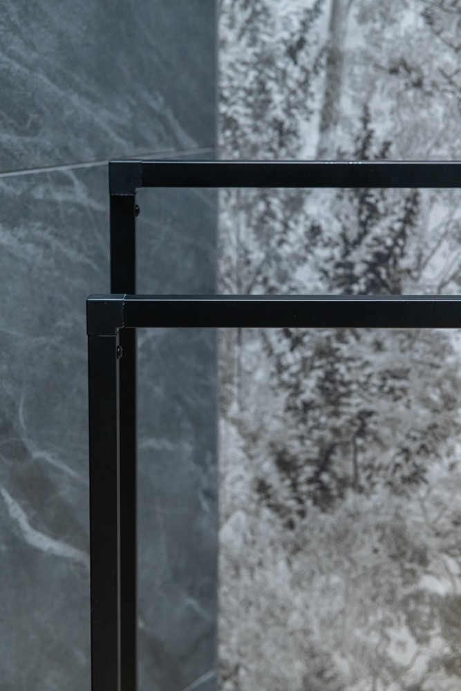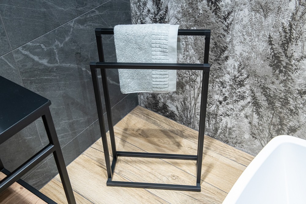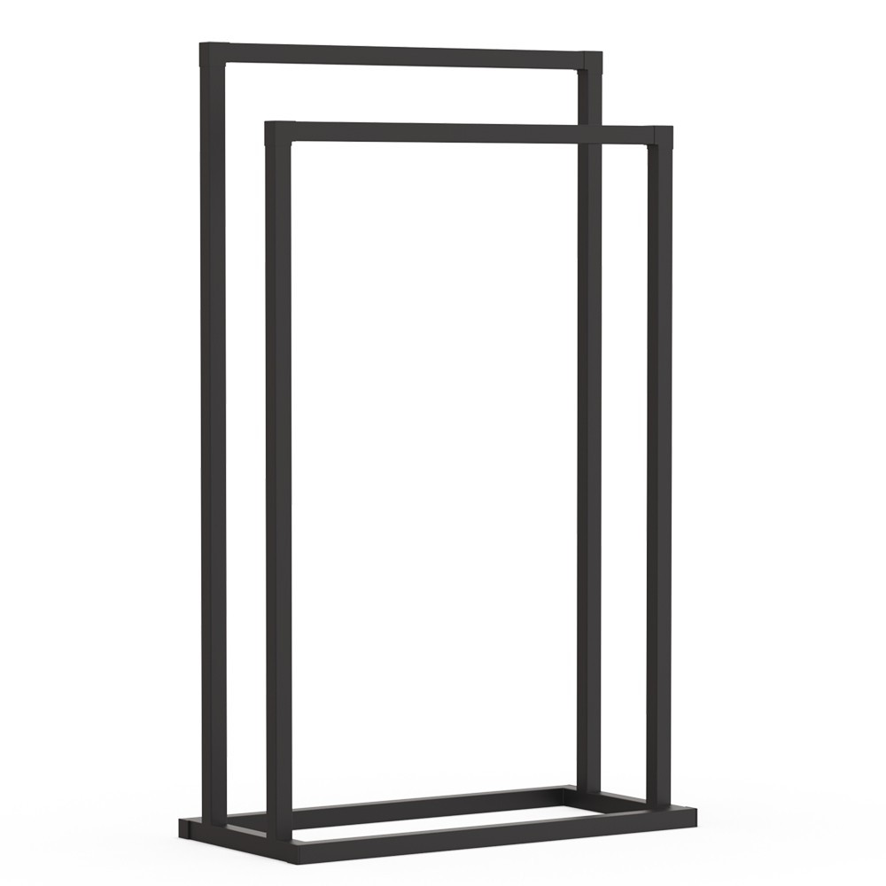 Moderní stojící věšák na ručníky se dvěma rameny, navržený v jednoduché geometrické formě. Je vyroben z oceli lakované černě s matným povrchem. Stojan na ručníky má stabilní základnu zajištěnou plastovými nožičkami. Výrobek vyžaduje vlastní montáž.