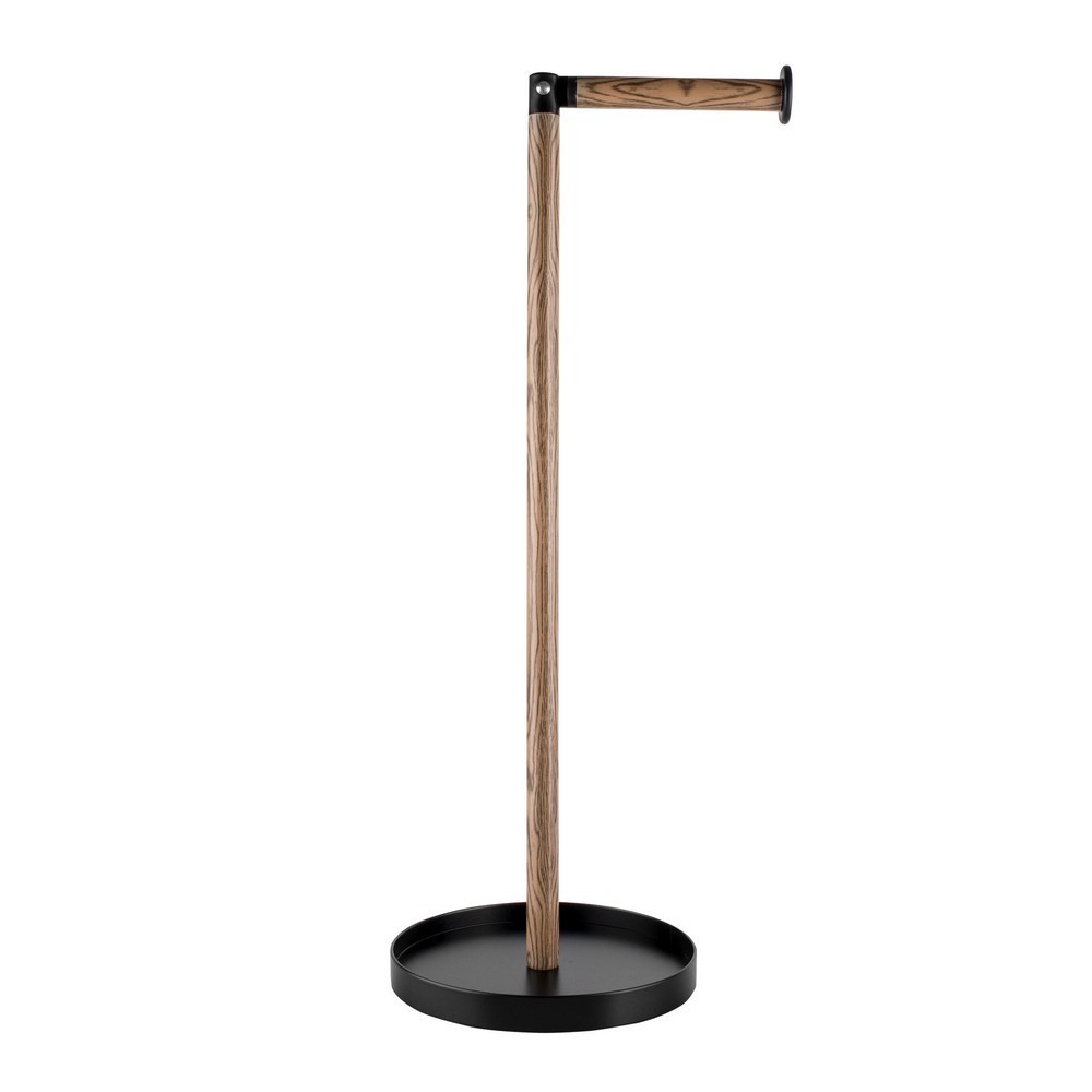 Moderní koupelnový stojan na toaletní papír, který pojme celkem 5 rolí toaletního papíru. Vyrobeno z prvků imitujících dřevo a černou ocel.