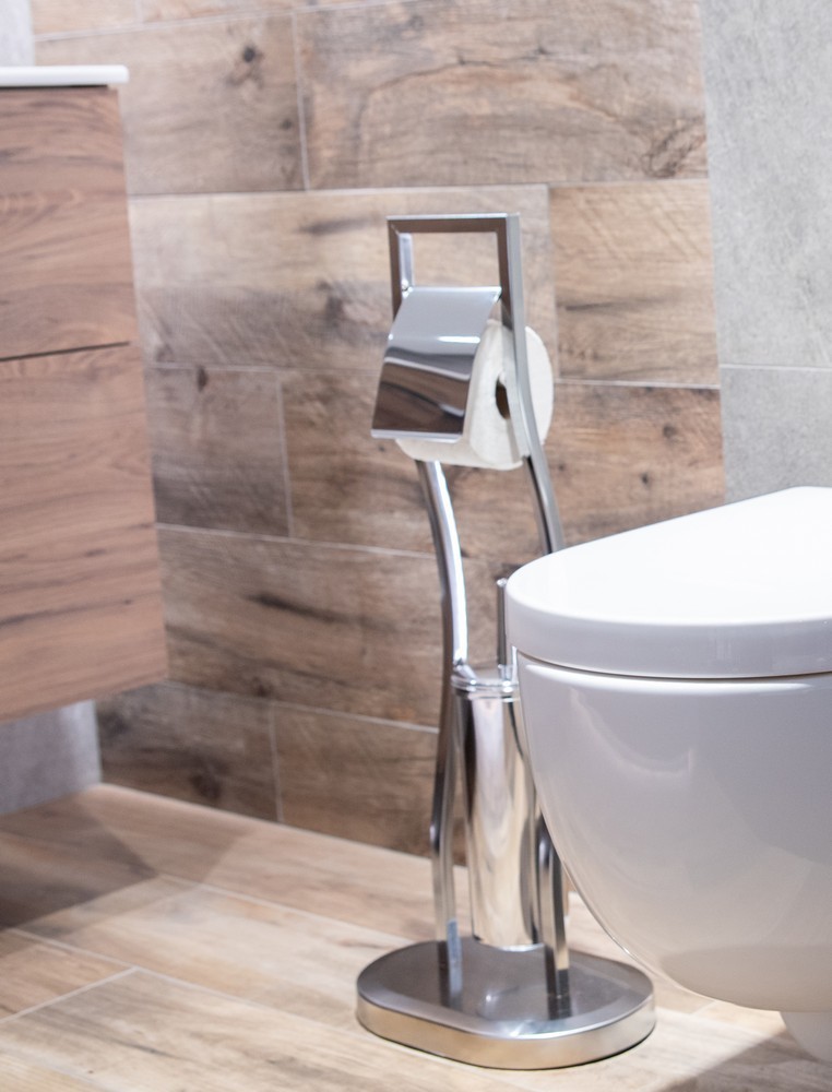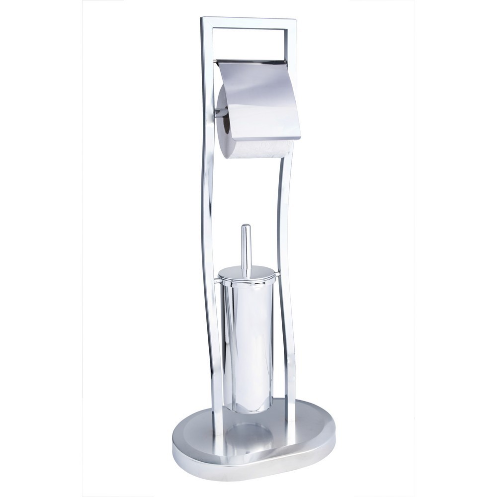 Elegantní koupelnový stojan na toaletní papír se závěsným WC kartáčem z lesklé pochromované oceli. Má masivní základnu a je velmi stabilní. Role papíru je kryta funkční chlopní. Nádobu na kartáč lze pro snadné čištění vyjmout. WC kartáč je diskrétně ukryt v nádobě díky estetickému krytu na jeho rukojeti.