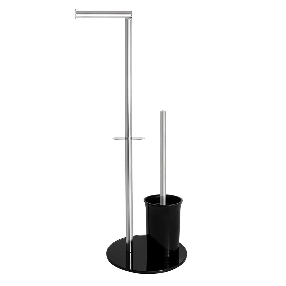Stojan na toaletní papír se štětkou a prostorem pro náhradní roli papíru. Má černou základnu a černý zásobník na štětku, což mu dodává moderní vzhled.