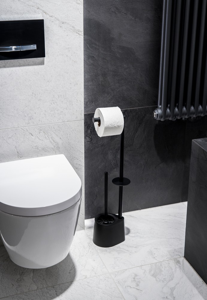 Minimalistický černý stojan na toaletní papír se štětkou. Má prostor pro náhradní roli papíru.