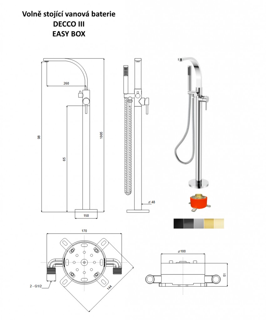 Vysoká vanová baterie DECCO III s výškou 1005 mm od evropského dodavatele vodovodních baterií BESCO. Baterie je určena pro instalaci do podlahy (včetně instalačního box pro snazší instalaci)a oceníte ji zejména pokud máte volně stojící vanu. Dodáváno včetně příslušenství - sprchová hlavice s hadicí. Stojánková vanová baterie pro moderní koupelny. Dodáváme v šesti barvách a to lesklý chrom, černá matná nebo grafitová, zlatá, zlatá lesklá, zlatá broušená.