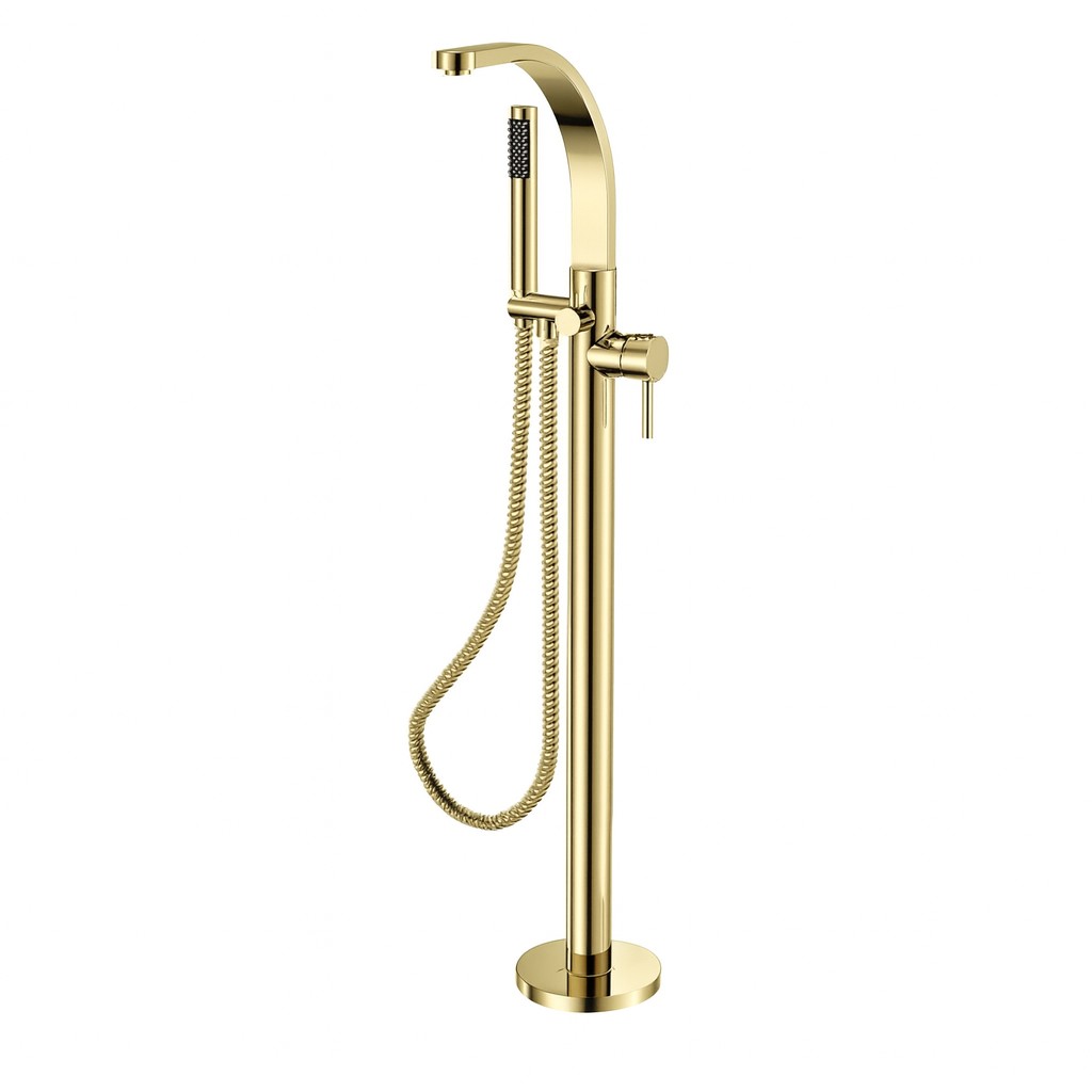 Stojánková baterie do podlahy vypadá skvěle v kombinaci s volně stojící vanou.