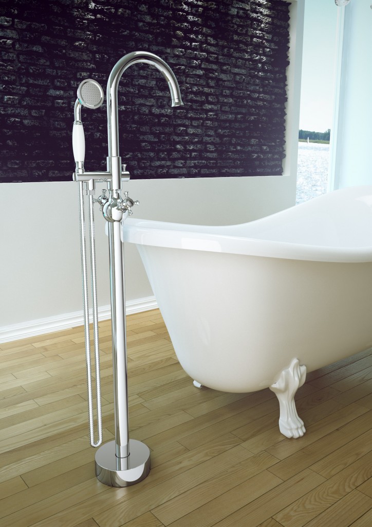 Stojánková baterie do podlahy vypadá skvěle v kombinaci s volně stojící vanou.