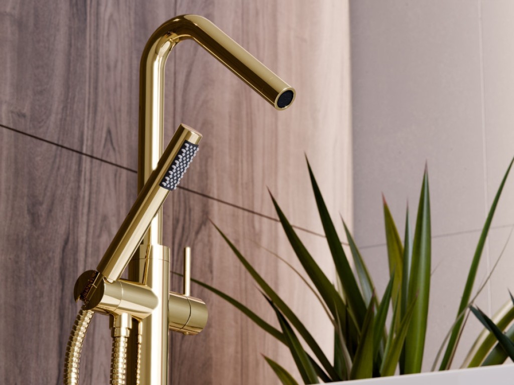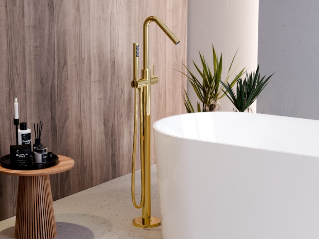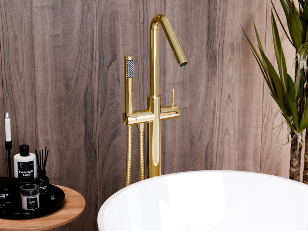 Vysoká vanová baterie VEO III ve zlaté lesklé barvě s výškou 1102 mm od evropského dodavatele vodovodních baterií BESCO. Baterie je určena pro instalaci do podlahy (včetně instalačního box pro snazší instalaci) a oceníte ji zejména pokud máte volně stojící vanu. Dodáváno včetně příslušenství - sprchová hlavice s hadicí. Stojánková vanová baterie pro moderní koupelny. Dodáváme v pěti barvách a to chrom, černá, grafitová, zlatá lesklá nebo zlatá broušená.