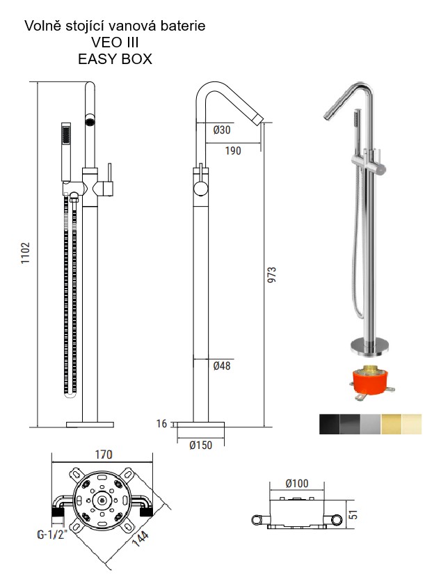 Vanová stojánková baterie je dodávána včetně příslušenství (instalačního box pro snazší instalaci, sprchová růžice a hadice). Dodáváme v pěti barvách a to chrom, černá, grafitová nebo zlatá, zlatá lesklá, zlatá broušená.