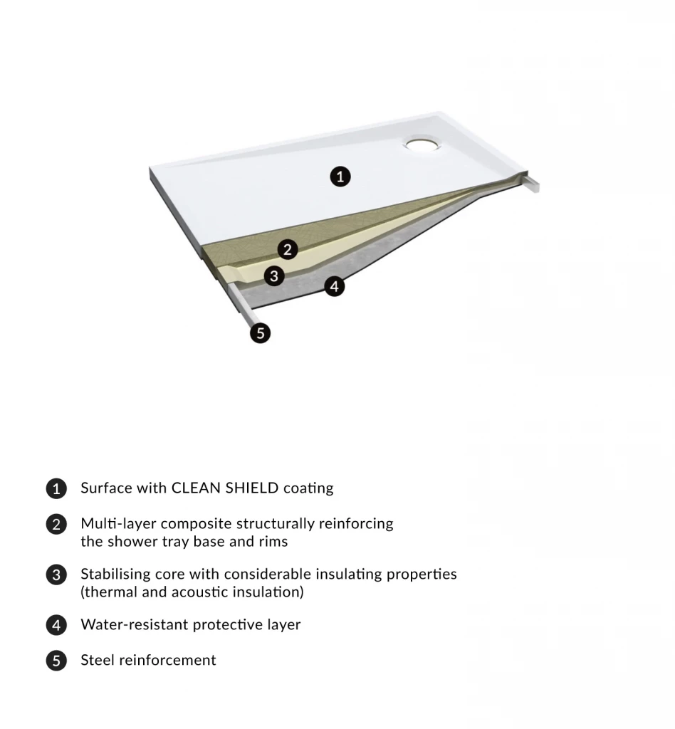 Sprchové vaničky STONE jsou vyrobeny z vícevrstvého kompozitního materiálu, který zajišťuje vysokou odolnost, pevnost a dlouhou životnost. Matný povrch s přirozenou kamennou strukturou je opatřen antibakteriální vrstvou CleanShield, která usnadňuje údržbu a zlepšuje hygienu. Stabilizační základna poskytuje účinnou tepelnou i zvukovou izolaci, zatímco těsnicí vrstva chrání před vlhkostí a tvorbou plísní.