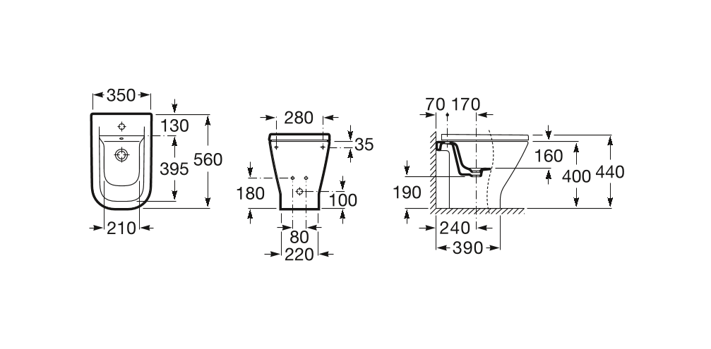 Stojící bidet THE GAP s otvorem pro baterii a přepadem, lze doplnit poklopem.