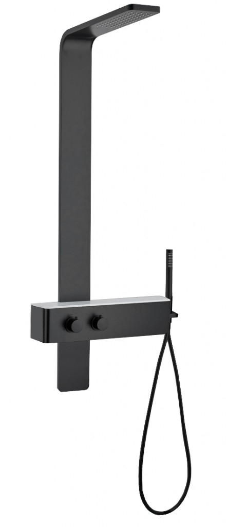 Jedná se o moderní sprchový, panelový systém Sund, který kombinuje horní a ruční sprchu. Jeho elegantní minimalistický design má černý povrch. Hlavní vertikální panel podpírá horní sprchovou hlavici, která má plochý, obdélníkový tvar a je integrována do horní části panelu. Pod ním jsou dva ovládací knoflíky, pro nastavení teploty a průtoku vody. Ruční sprcha je připevněna na boku pomocí hadice, což poskytuje všestrannost pro různé potřeby sprchování. Tento typ sprchového systému je často vybírán pro svůj moderní vzhled a multifunkční využití, díky čemuž je stylovým a praktickým doplňkem koupelny.
